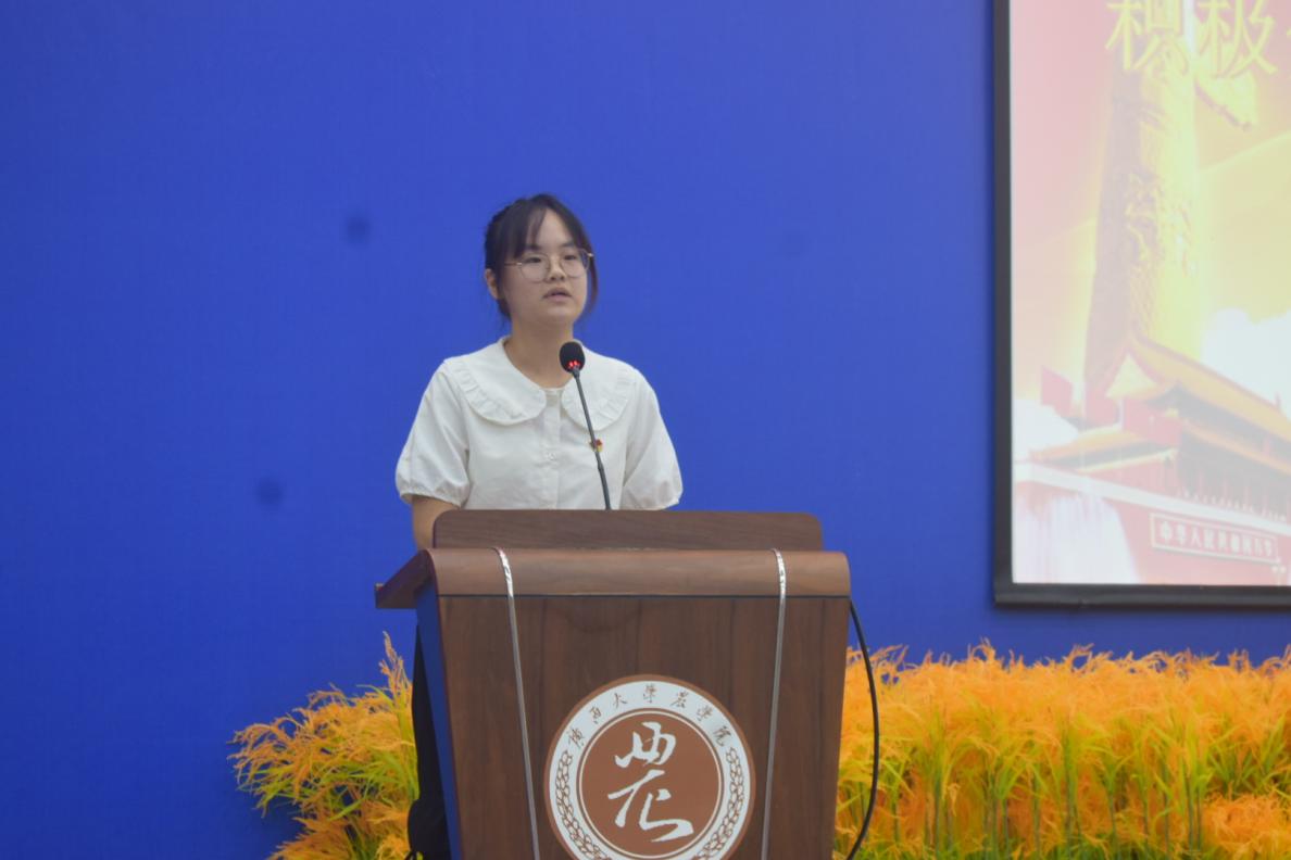 农学22级本科生赵昕雨同学作为学员代表上台发言,她表示作为一名新时代青年,要不断加强理论学习,坚定理想信念,补足精神之钙,增强纪律意识,时刻严格要求自己,发挥模范带头作用,积极参加实践锻炼,增强实践能力,用实际行动展现能力与担当。