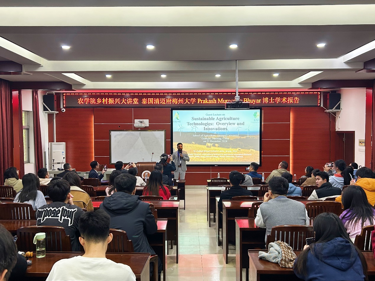 202412月21日,泰国梅州大学Prakash Murgeppa Bhuyar博士应邀到我院进行学术交流,为师生们作了一场题为可持续农业技术:概述与创新学术报告,报告会由韦燕副院长主持。