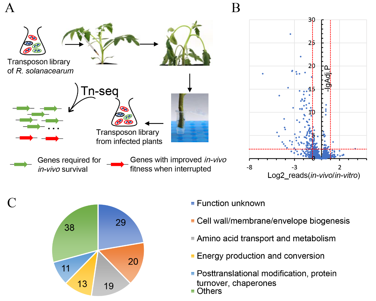 该研究将青枯雷尔氏菌转座插入突变体文库混合接种至宿主番茄植株,利用番茄植株内环境作为选择压力,通过Tn-seq分析了突变体库中各突变体所占有的相对丰度,在侵染宿主番茄前后的变化。从而全基因组鉴定了青枯雷尔氏菌的番茄宿主适应性基因。Tn-seq分析发现,青枯雷尔氏菌的“细胞壁/膜/生物膜合成”、“氨基酸的转运与代谢”、“能量产生和转化”、“翻译后修饰、蛋白质周转和伴侣”等相关基因对其在番茄植株中的生存起到重要作用。随后,该研究就每个功能类选择了部分基因实施单一敲除,测定了基因缺失突变体的致病力、植物体内定殖能力以及竞争适应性,验证了Tn-seq结果的准确性。综上所述,该研究全基因组鉴定并验证了青枯雷尔氏菌的番茄宿主适应性基因,有助于全面了解青枯雷尔氏菌的致病机制。