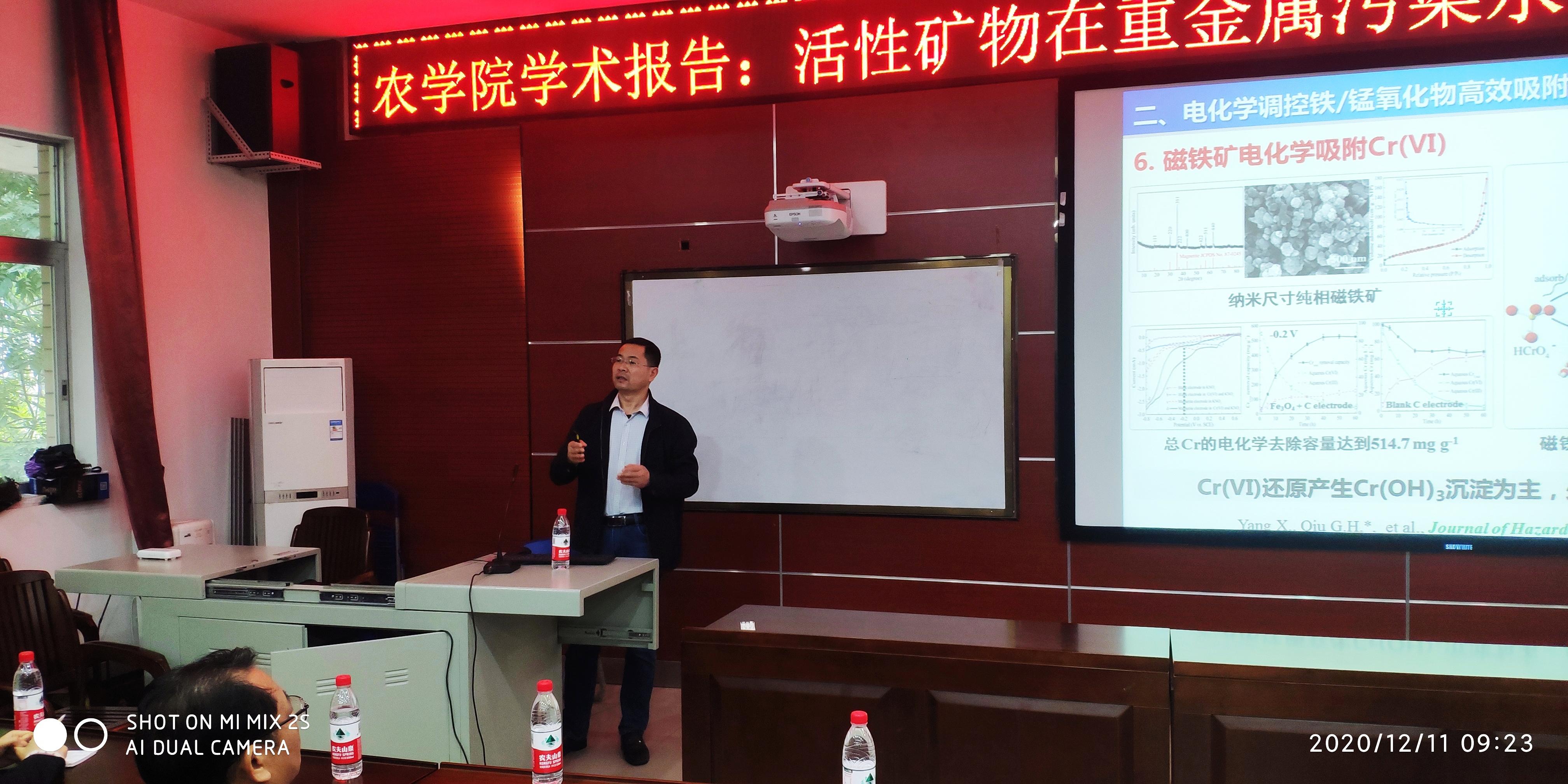 2020年12月11日上午,教育部新世纪优秀人才支持计划和中组部“万人计划”科技创新领军人才、华中农业大学邱国红教授应邀在农学院306报告厅作题为“活性矿物在重金属污染水体及土壤修复中的应用”的学术报告,报告会由王令强教授主持,学院副院长何新华教授代表学院欢迎邱老师的到访并做介绍,100多名师生聆听了报告。