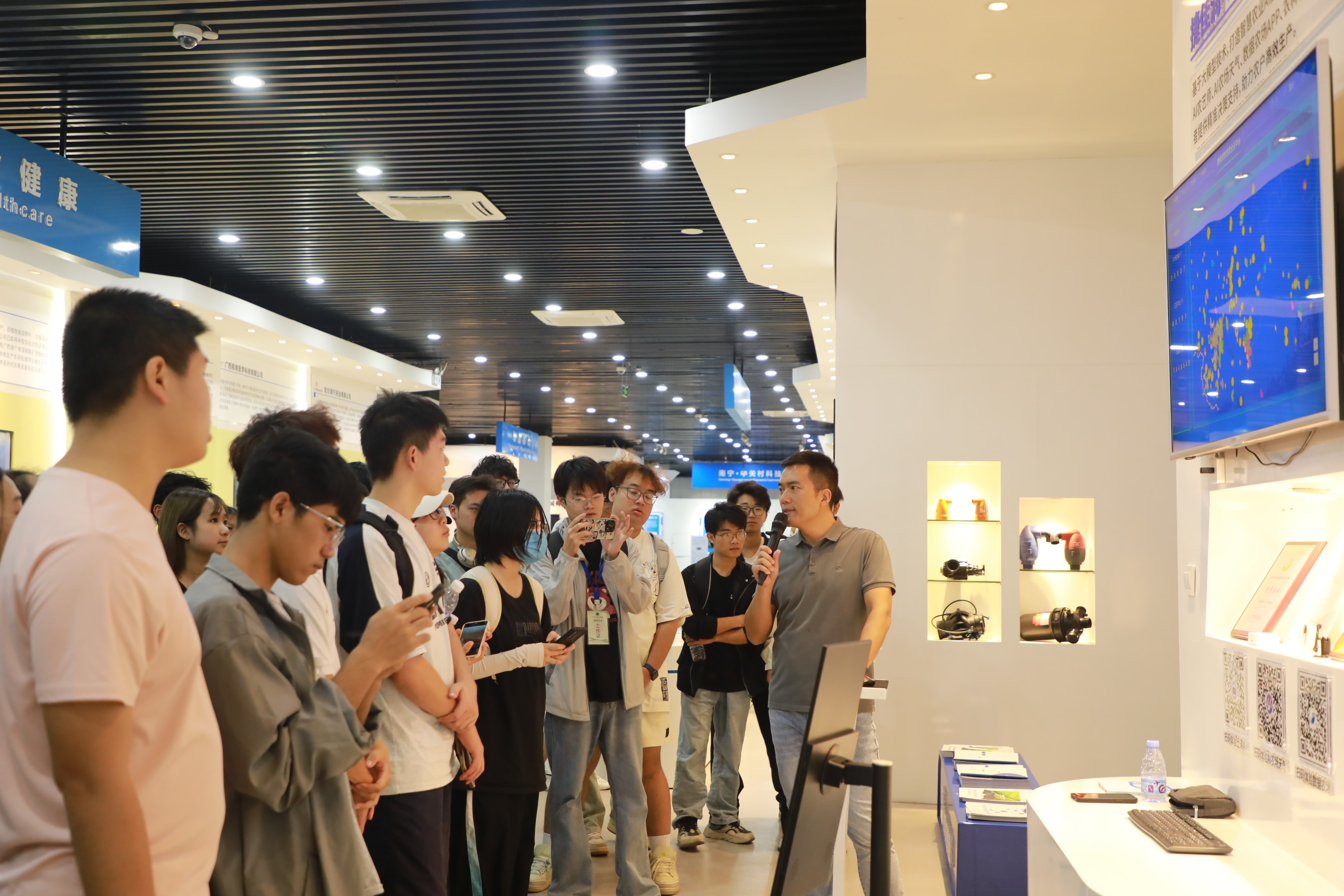 在农科新城展厅,同学们通过老师的介绍及观看短视频了解农科新城的规划布局、研究现状和广西大学涉农学科发展情况。通过参观,同学们了解到农科新城在推动农业现代化、科技创新等方面取得的显著成就,对农科新城的整体规划和未来愿景有了更加清晰的认识。