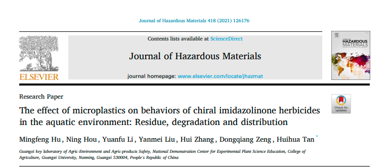 广西农业环境与农产品安全重点实验室/农学院农药残留与环境安全研究团队20215月在国际知名期刊Journal of Hazardous Materials上在线发表了题为“The effect of microplastics on behaviors of chiral imidazolinone herbicides in the aquatic environment: Residue, degradation and distribution”研究论文。微塑料是一类粒径小于5毫米的塑料碎片或颗粒,广泛存在于水体和陆地环境中。咪唑啉酮类除草剂因在环境中持久性长的特点,容易污染水体和土壤。近年来,微塑料与环境污染物相互作用的行为备受关注。然而,关于微塑料对该类除草剂的环境行为影响和机制还不清楚。在本研究中,通过建立水-沉积物微宇宙系统的方法在对映水平研究了聚乙烯微塑料对三种咪唑啉酮类除草剂在水生系统中环境行为的影响。结果表明,微塑料能够通过吸附和解吸附的方式显著影响该类除草剂在水生环境中迁移、降解和分配行为,明确了微塑料是影响咪唑啉酮类除草剂在水生环境中行为归趋的重要因素。研究结果为更加全面的评价咪唑啉酮类除草剂的环境风险提供了一定的科学依据。248cc永利集团博士研究生胡明锋为该论文的第一作者,谭辉华教授为通讯作者。该研究得到了国家自然科学基金项目支持。原文链接https://doi.org/10.1016/j.jhazmat.2021.126176