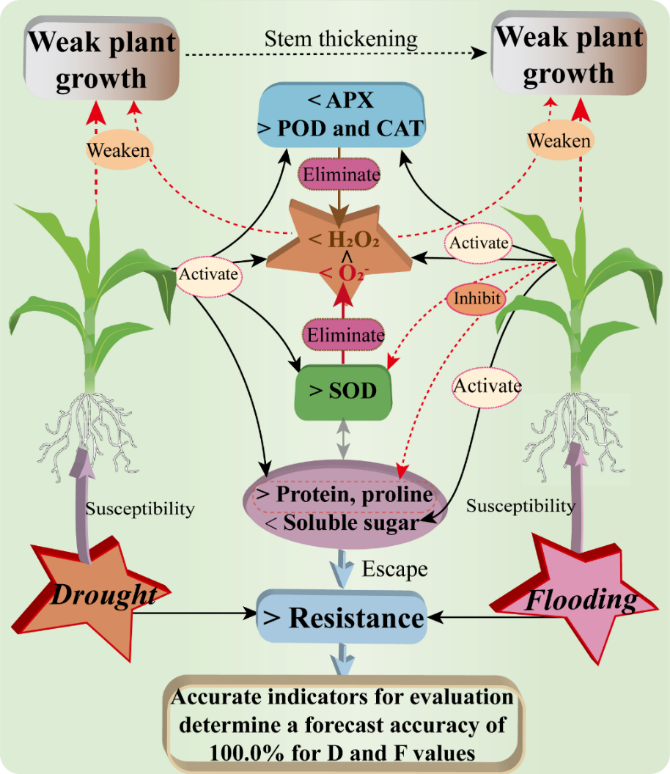 本研究通过综合评估D值、抗性系数、主成分分析、相关分析、逐步回归分析和聚类分析对多个生理指标进行综合分析,筛选出超氧化氢歧化酶(SOD)、过氧化物酶(POD)、过氧化氢酶(CAT)、抗坏血酸过氧化物酶(APX)、脯氨酸、可溶性糖、可溶性蛋白质、株高、叶面积和茎粗作为评估玉米抗旱/涝性的关键指标,对综合D值和综合主成分值(F值)预测精度可达100.0%,其中,APX在作物抵御旱涝胁迫中发挥重要作用。综合评估D值、F值和抗性系数,筛选出抗旱型、抗涝型和敏感型玉米品种,并通过田间试验验证该评估分析方法的准确性。
