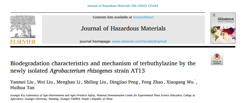 近日,广西农业环境与农产品安全重点实验室谭辉华教授研究团队在国际知名期刊Journal of Hazardous Materials上在线发表了题为“Biodegradation characteristics and mechanism of terbuthylazine by the newly isolated Agrobacterium rhizogenes strain AT13”研究论文,报道了Agrobacterium rhizogenes AT13对特丁津进行生物降解方面的最新研究成果。