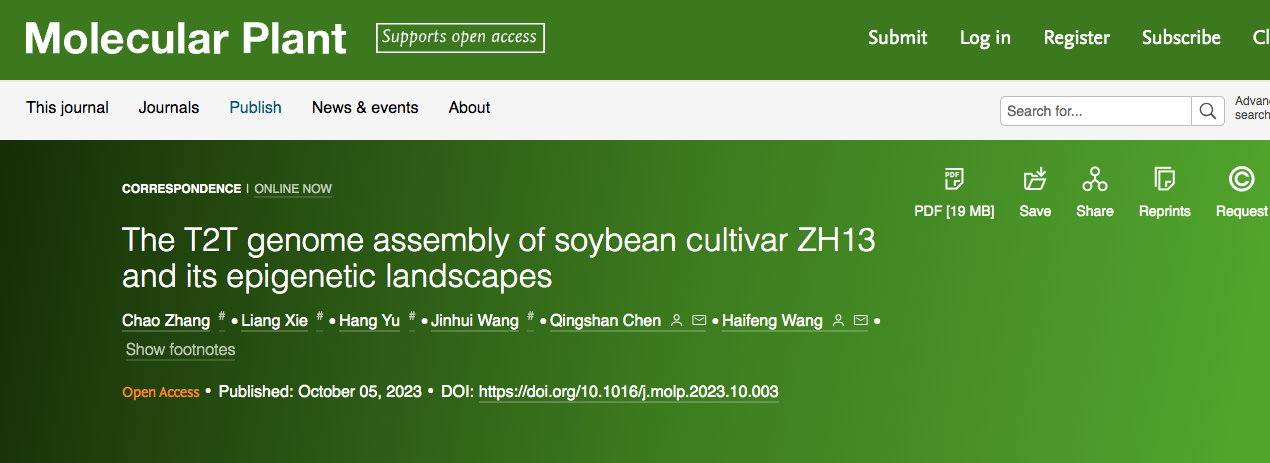 近日,我校农学院王海峰教授团队成功发布了中国大豆品种“中黄13”(ZH13)的完整基因组“ZH13-T2T”,并首次绘制了该大豆品种的表观遗传修饰图谱。这一研究结果以 “The T2T genome assembly of soybean cultivar ZH13 and its epigenetic landscapes” 为题发表于《分子植物》(Molecular Plant)。广西大学是第一署名单位,广西大学博士生张超、助理教授谢亮、博士生于航以及东北农业大学副教授王锦辉为论文的共同第一作者,广西大学王海峰教授和东北农业大学陈庆山教授为该论文的通讯作者。
