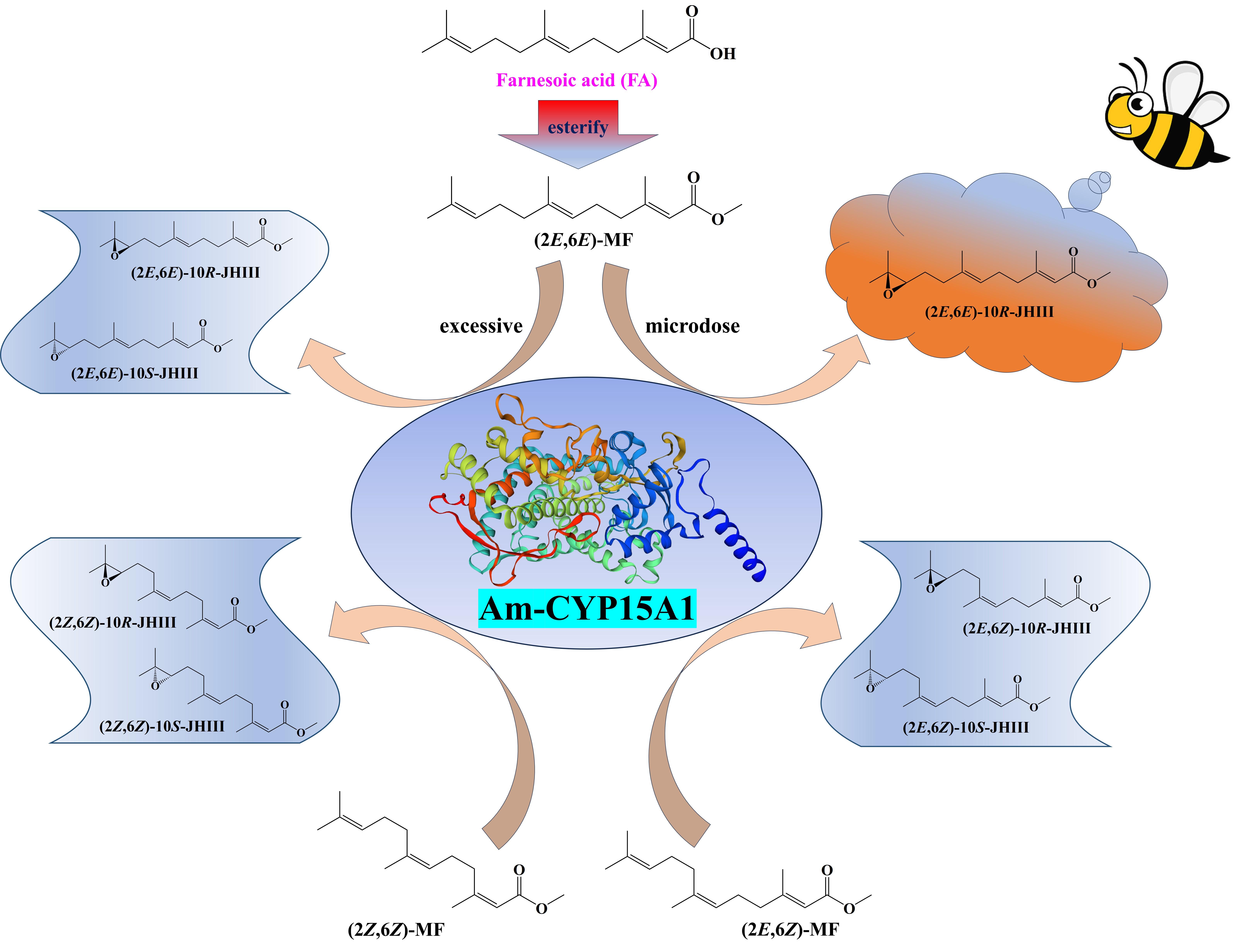大部分昆虫体内均合成JH III用于调控其生理生物学功能,且均特异性合成R-JH III,但对于昆虫是如何精确调控并实现立体构型特异性合成,一直是生物学上未解之迷。团队为此进行了长达了4年的研究,首先原核表达获得蜜蜂JH III终端合成酶CYP15A1、JH结合蛋白JHBP和水解酶JHEH,通过色谱手性拆分并经圆二色色谱检测,获得独立的R和S-JH III,建立稳定的Tris-HCl培养体系,结合现代UPLC-MS/MS高精确分析方法,深入研究昆虫R-JH III的立体合成机制。结果表明,JHBP、JHEH对R或S-JH III并无特异性保护结合和水解,蜜蜂R-JH III终端合成途径遵循“先酯化后环氧化物”的顺序,CYP15A1偏好于催化底物甲基法尼酯MF进行环氧化,对前体底物保幼激素酸JHA催化效率低。对底物MF平面构型具有高度识别,蜜蜂通过调控前体MF几何构型(2E,6E)的精准合成,精确调控生成2E,6E,10R-JH III,改变MF几何构型(2E,6E;2E,6Z;2Z,6Z)将导致JH III在几何、立体结构和比例上的改变。同时,蜜蜂可精确控制体内前体MF滴度,从而调控R-JH III合成,改变MF滴度则同时合成S-JH III。我们的研究首次阐明了昆虫体内R-JH III的立体合成分子机制,为进一步揭示昆虫JH III在变态发育、繁殖调控功能中的立体差异性,以及为基于JH立体高效干扰的有害生物防治分子靶标的筛选提供一种崭新思维。248cc永利集团2019级博士生侯建敢为该论文的第一作者,李雪生副教授为论文的唯一通讯作者,本研究工作得到国家自然科学基金项目及广西农业环境与农产品安全重点实验室的支持。(J. Agric. Food Chem.2023.11,论文链接https://doi.org/10.1021/acs.jafc.3c05385)