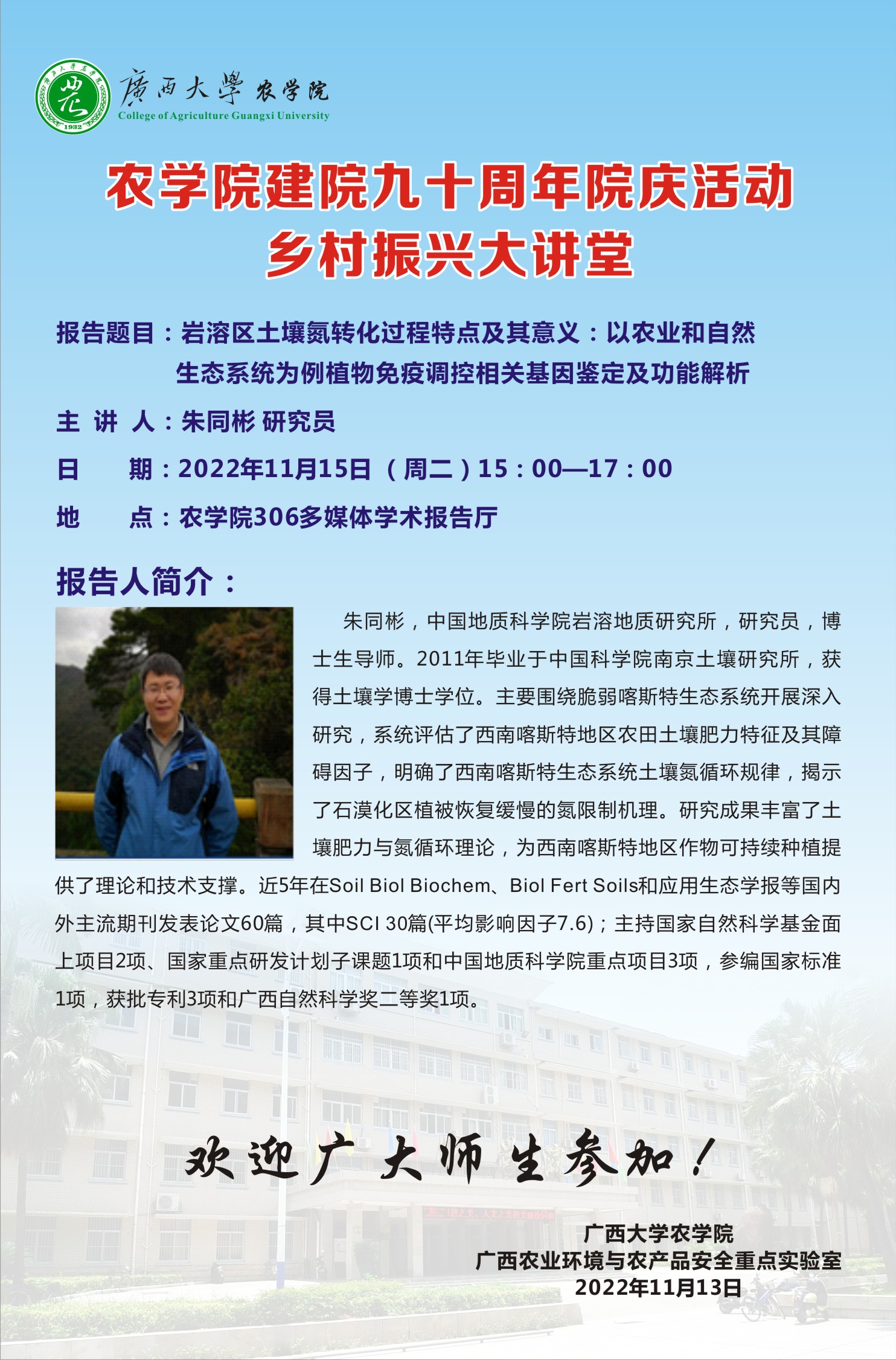 农学院建院九十周年院庆学术活动-岩溶区土壤氮转化过程特点及其意义:以农业和自然生态系统为例植物免疫调控相关基因鉴定及功能解析--朱同彬
