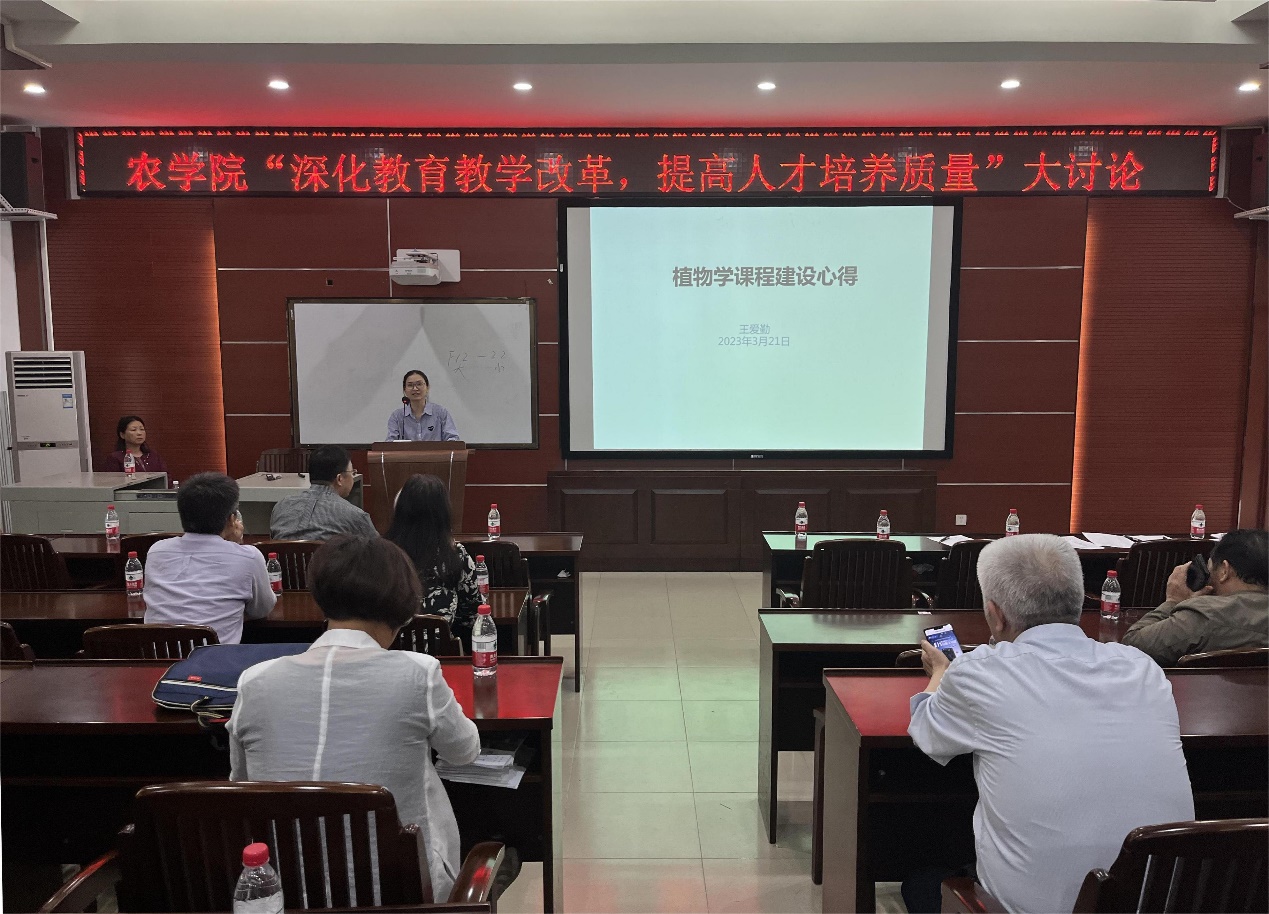 3月21日,根据学校《关于开展广西大学“深化教育教学改革提高人才培养质量”大讨论的通知》西大教〔2023〕7号要求,农学院开展了“深化教育教学改革提高人才培养质量”第二场专题大讨论,探讨如何深化“互联网+教育教学”改革创新,促进信息技术与教育教学的深度融合,加强一流课程建设,提高人才培养质量。自治区级一流本科课程负责人王爱勤教授应邀作了题为“《植物学》课程建设心得”的报告。院长李建雄,副院长韦燕燕,院长助理邹承武,农学院全体专任教师参加了本次研讨会。会议由副院长韦燕燕主持。