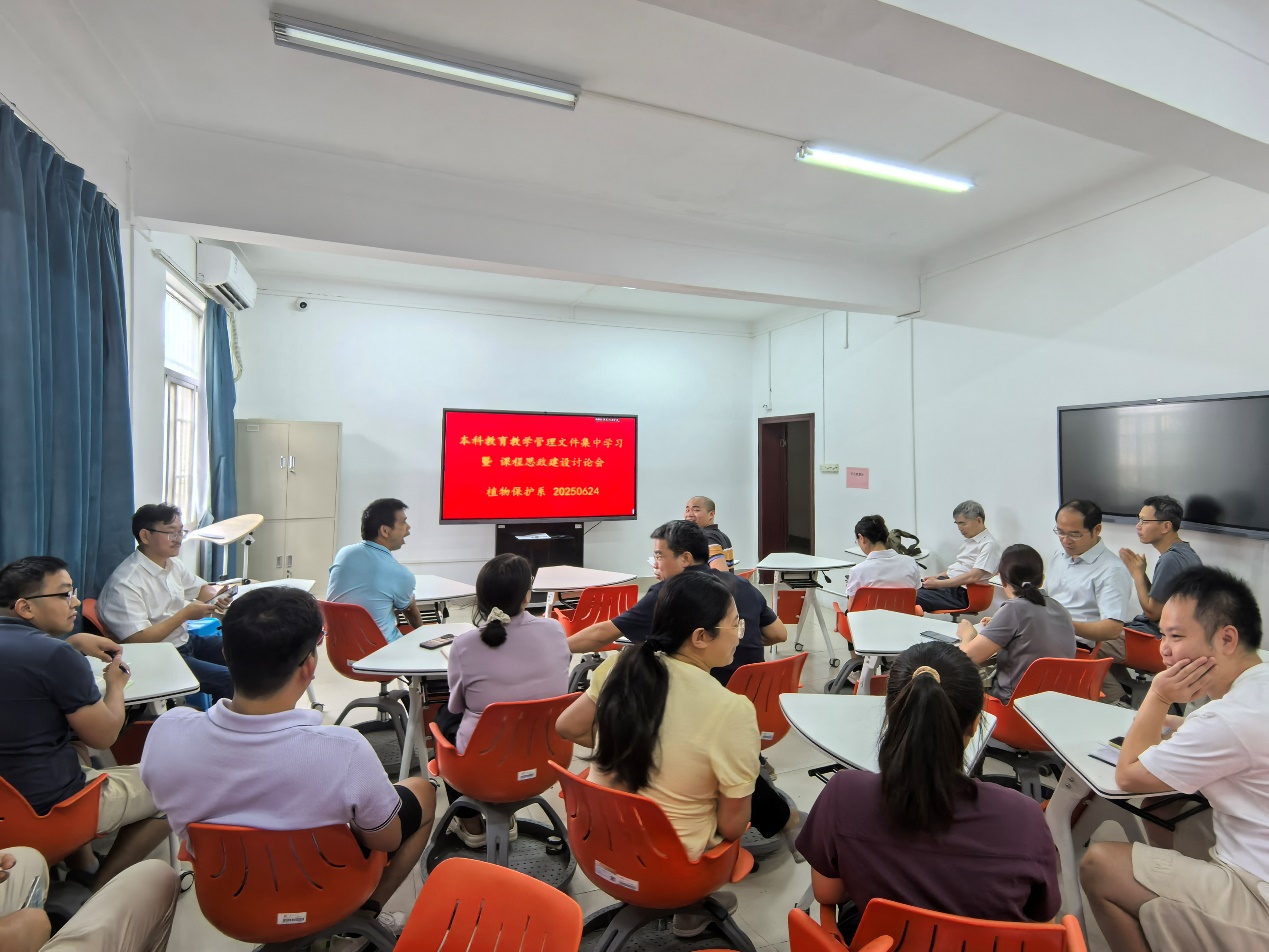 2025年6月24日,我院植物保护系在学院336互动教室召开了本科教育教学管理文件集中学习会暨课程思政建设讨论会。本次会议由植物保护系副主任郑德洪副教授主持,植物保护系主任谭辉华教授,以及陈保善教授等植物保护系全体教师参加会议。