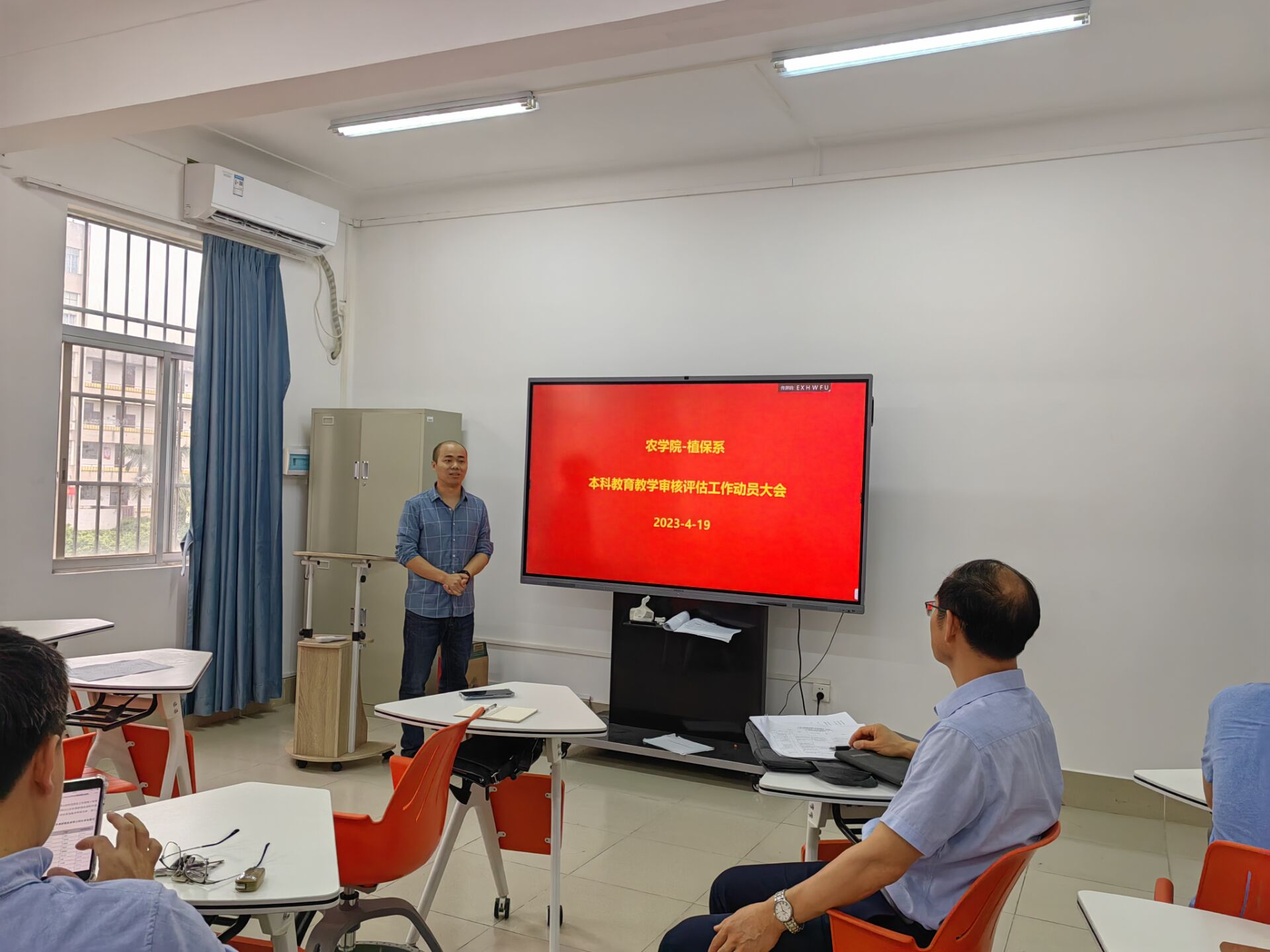 2023年4月19日,我院植物保护系在学院336召开本科教育教学审核评估工作动员大会。本次会议由植物保护系副主任郑德洪副教授主持,植物保护系主任谭辉华教授、副主任李雪生副教授,以及植物保护系全体教师参加会议。