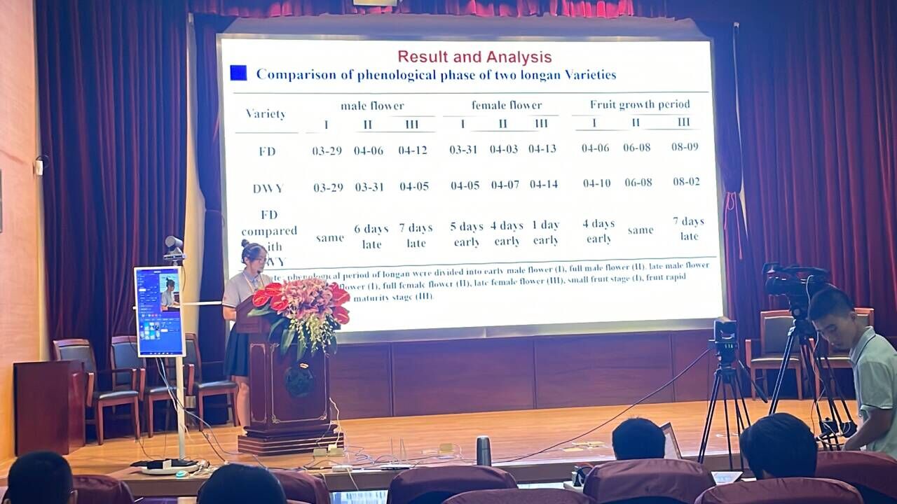 2023年6月,由邓英毅老师带队248cc永利集团韦淑艳同学参加了第七届国际荔枝龙眼和其他无患子科果树学术研讨会学术会议,在会上做了‘凤大晚蜜’龙眼在南宁的引种表现专题报告,发表了《‘凤大晚蜜’龙眼在南宁的引种表现》论文。
