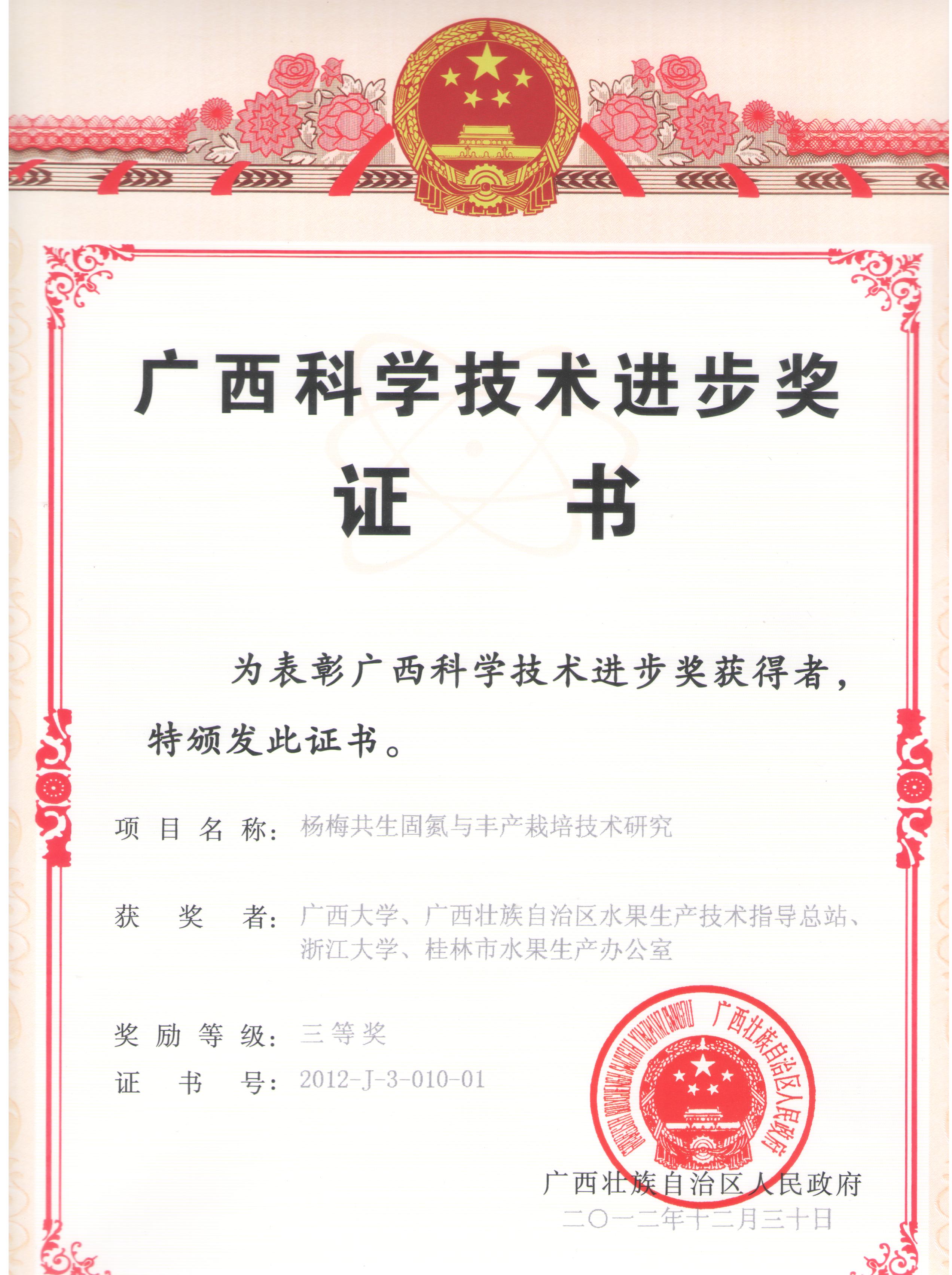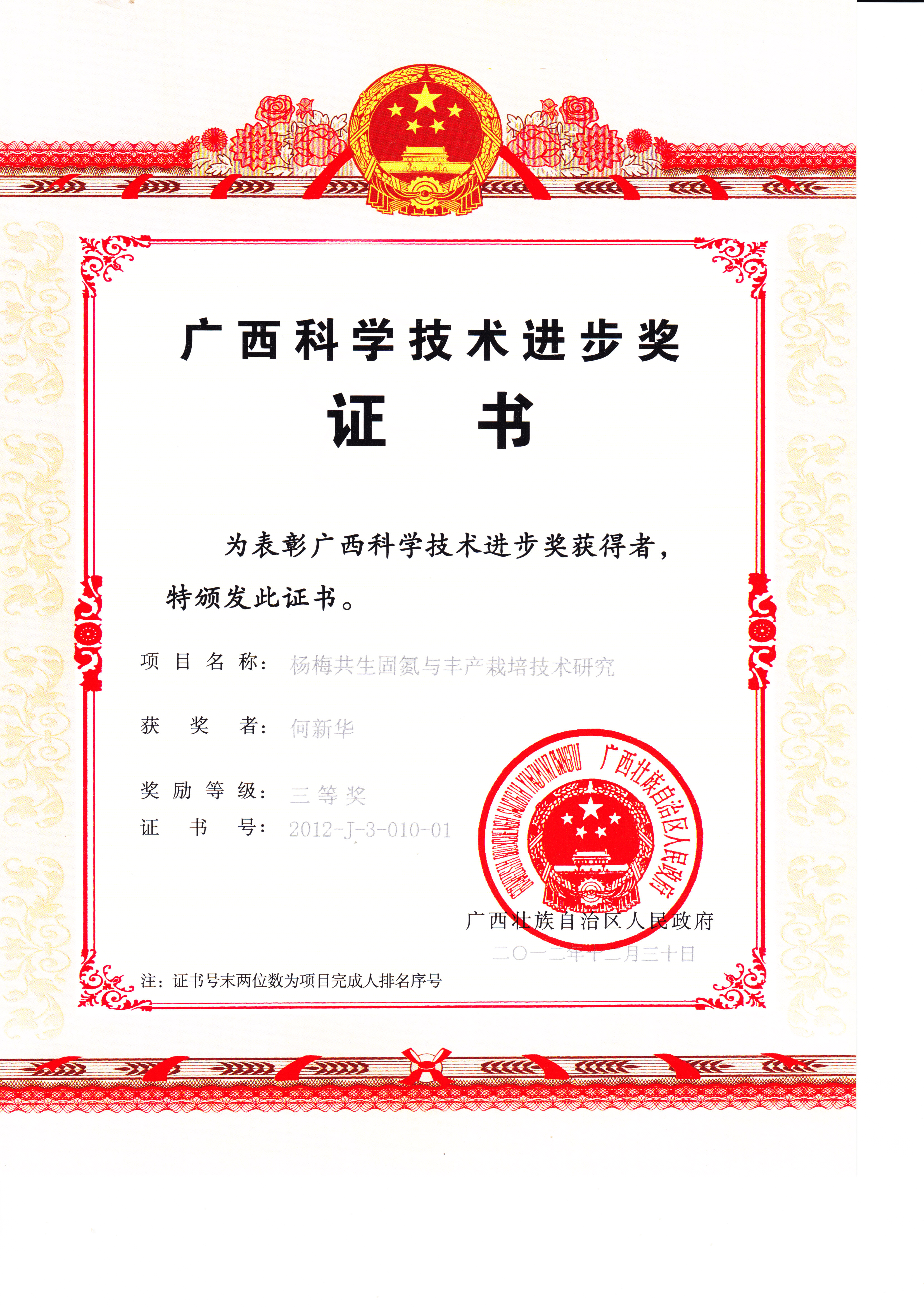 三等奖 何新华-杨梅共生固氮与丰产栽培技术研究(2012、12)
